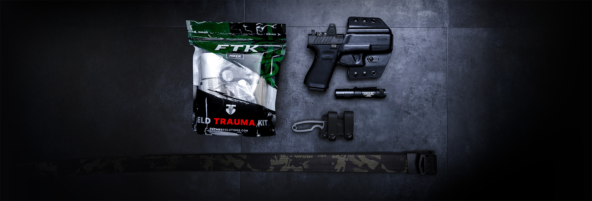 Whether for hiking or camping, rugged gear is needed to handle the elements with confidence. For OWB (outside-the-waistband) carry, The Contour is a tremendously strong-side holster that can be secured no matter what kit you are carrying. A fixed-blade, like the GW2, is a rigid, portable knife perfect for the outdoors. Next, a medical kit like the Field Trauma Hiker Kit, for instance, provides a variety of first aid relief. A duty-grade flashlight like the Streamlight Protac is a tremendous option for navigating dark terrain. Hold everything up with the durable strength of an EDC Kore Belt, and you are good to go.