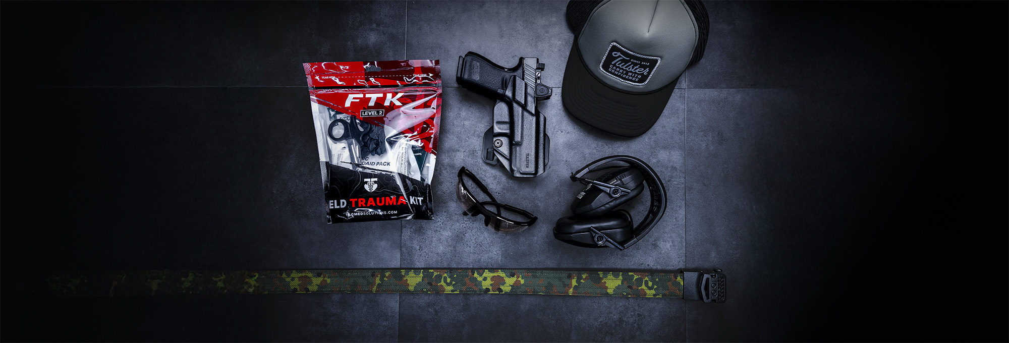 Whether teaching a shooting course or competing in a USPSA match, here is the gear for you. For starters, we have the OWB (outside-the-waistband) Range+ holster. With compatibility with multiple drop-leg mounting solutions or its factory paddle backing, this holster is perfect for demos and competition. For safety, we have any of the TacMed Solutions Trauma Kits. For this example, we will focus on the 2T since it comes with a tourniquet. Of course, you will need a good belt from Kore Essentials. Their gun belt is perfect for basic setups, while their battle belt is a great option for putting together a complete system. Naturally, you will need some range gear, so be sure to stock up on eye/ear pro, range bag, and of course a Tulster hat to keep you looking cool.
